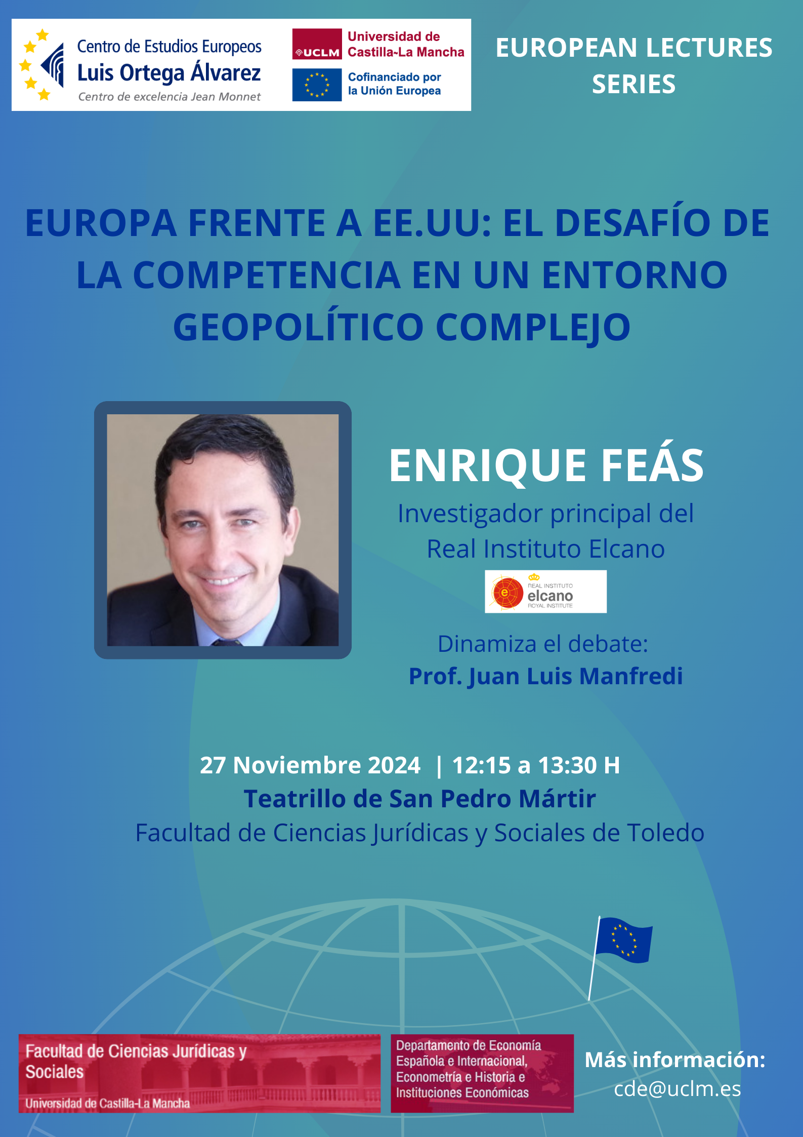 El pasado 27 de Noviembre, en el Teatrillo de San Pedro Mártir en la Facultad de Ciencias Jurídicas y Sociales de Toledo, se llevo a cabo una Jornada sobre Europa frente a EE.UU., en la que nos acompaño Enrique Feás, Investigador principal del Real Instituto Elcano.