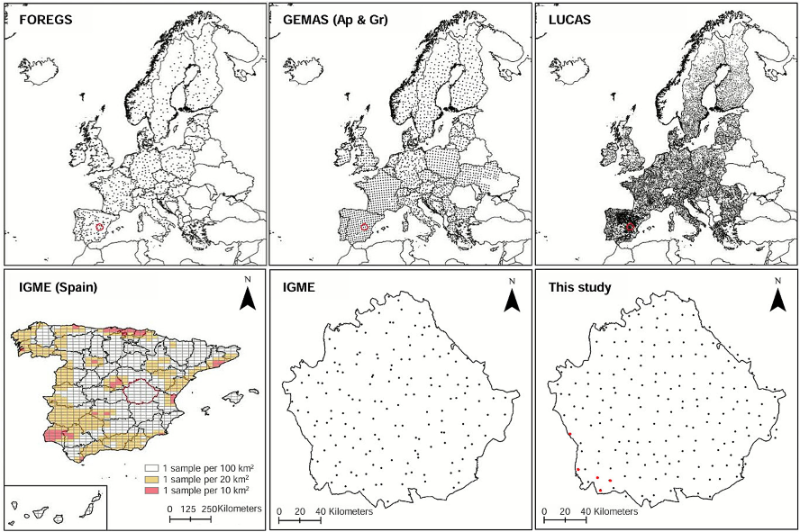 Mapas de distribución de muestras procedentes de distintos programas europeos (FOREGS, GEMAS y LUCAS) y nacionales (IGME) en España. La figura muestra la localización de la provincia de Cuenca y los puntos de muestreo realizados en este estudio. Las muestras resaltadas en rojo corresponden a aquellas utilizadas para evaluar la influencia de la preparación de las muestras (verificación del efecto matriz).