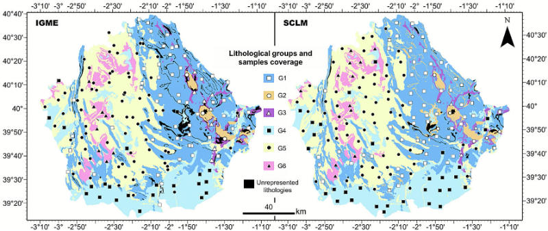 Mapa de los programas de muestreo del IGME y de la SCLM. El mapa muestra la simbología de las muestras clasificadas en los seis grupos litológicos establecidos (G1–G6), superpuesta sobre un fondo geológico simplificado. Dicho fondo se elaboró a partir de los Mapas Geológicos de España a escala 1:1.000.000. Las litologías no representadas por el muestreo se muestran en color negro.