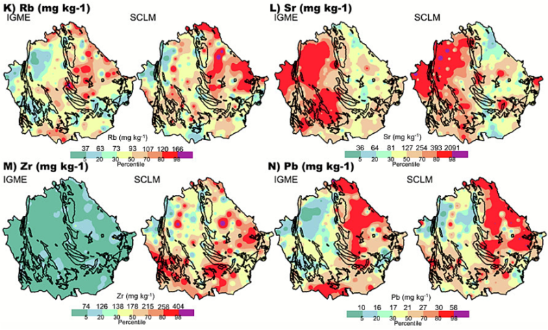 Se observó que una estrategia de muestreo sistemática y regular evita lagunas geoquímicas y aumenta la representatividad del material parental del suelo en las muestras. Se identificaron patrones geoquímicos diferenciados, con un grupo principal formado por Ti, Mn y Fe, junto con elementos traza como Cr, Ni, Cu, Zn, As, Rb, Sr, Zr y Pb, mientras que K, Ca y Sr presentan tendencias de distribución individuales. En conjunto, este estudio proporciona un método rápido y económico para la caracterización geoquímica de suelos en grandes áreas y para el establecimiento de niveles de fondo y de referencia a escala regional.