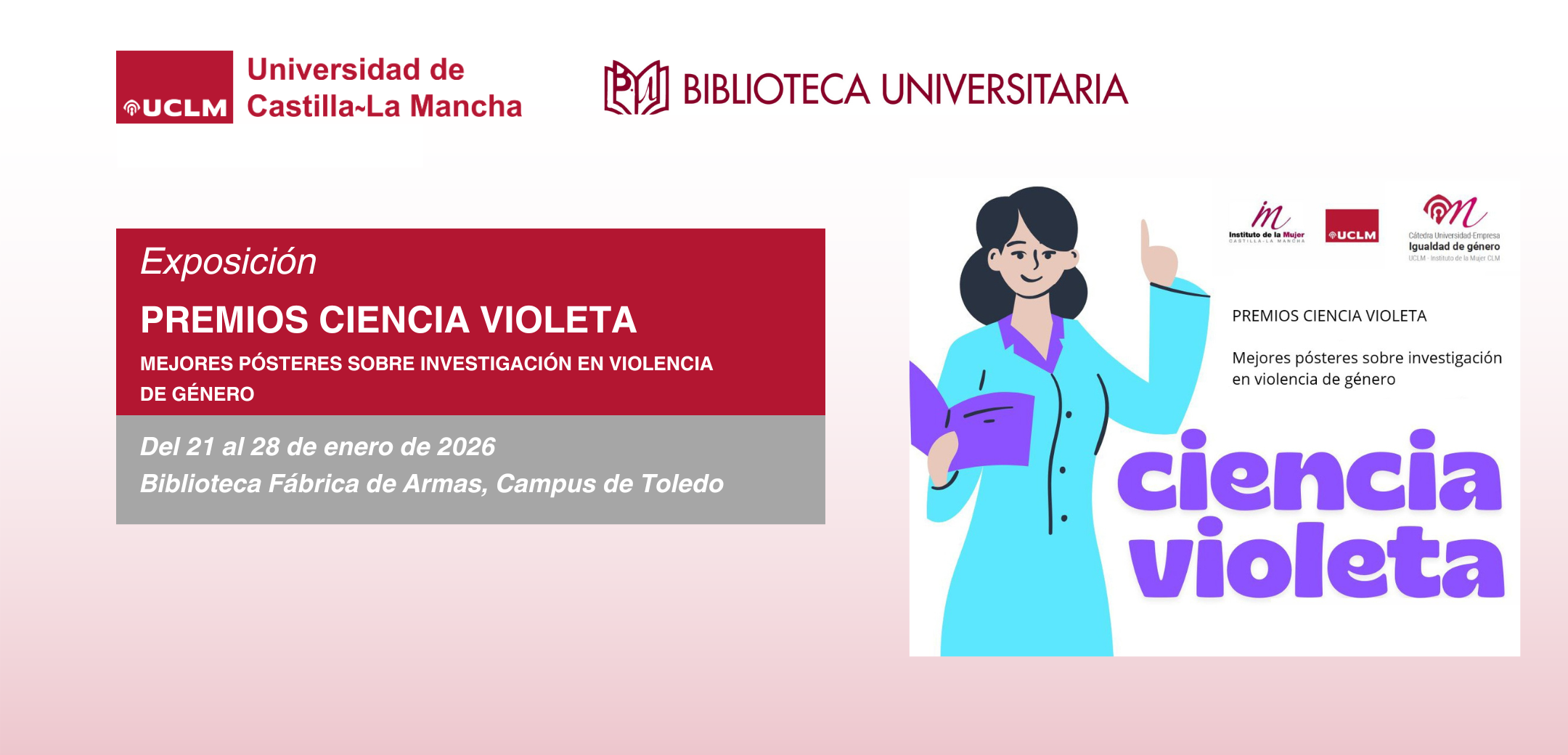 La Biblioteca de la Fábrica de Armas, en el Campus de Toledo, acoge, del 21 al 28 de enero, la exposición de los tres carteles ganadores del concurso Ciencia Violeta, una iniciativa de la Cátedra de Igualdad de Género de la UCLM que impulsa la investigación en violencia de género y la igualdad entre mujeres y hombres en el ámbito universitario.