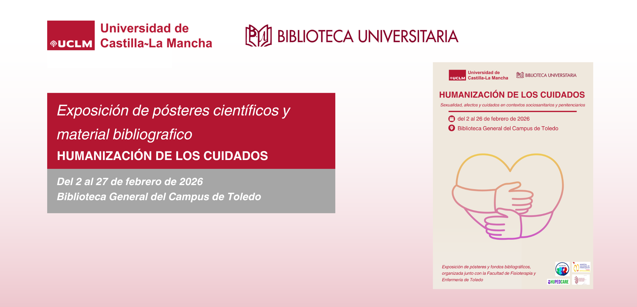 La Biblioteca General del Campus de Toledo, acoge la exposición de pósteres científicos “CuidArte: Humanización de los Cuidados. Descifrando Realidades Sociosanitarias”, organizada junto con la Facultad de Fisioterapia y Enfermería de Toledo.