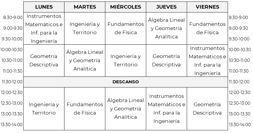 Horarios de 1º de Grado en Ingeniería Civil y Territorial, primer cuatrimestre